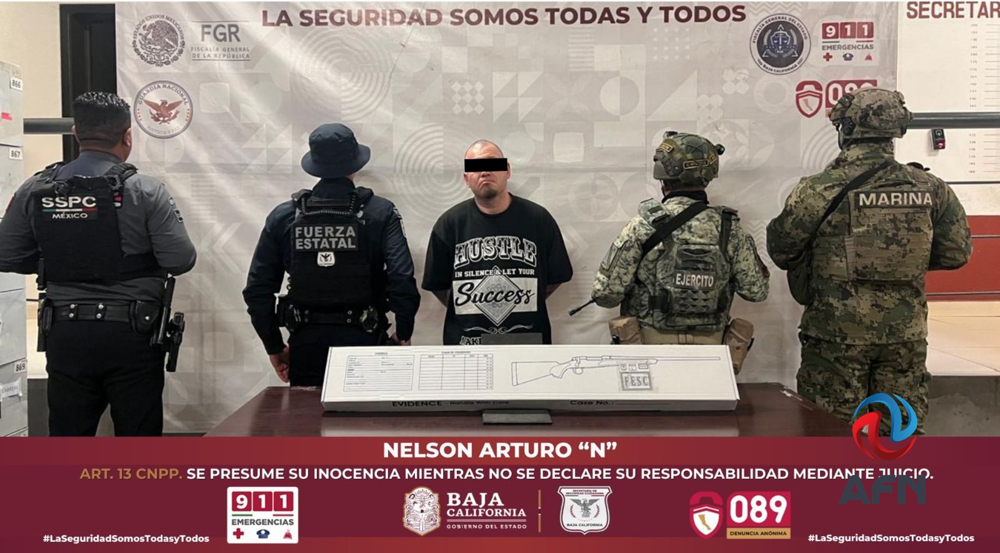 TIJUANA BC 3 DE MARZO DE 2026 (AFN).- Agentes de la Fuerza Estatal de Seguridad Ciudadana (FESC) detuvieron a un hombre identificado como Nelson Arturo, de 36 años de edad, en posesión de un fusil de asalto; el detenido estaría involucrado en la colocación de una corona fúnebre y una cartulina con amenazas a un mando de la Policía Municipal de Tijuana.