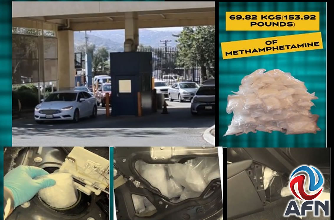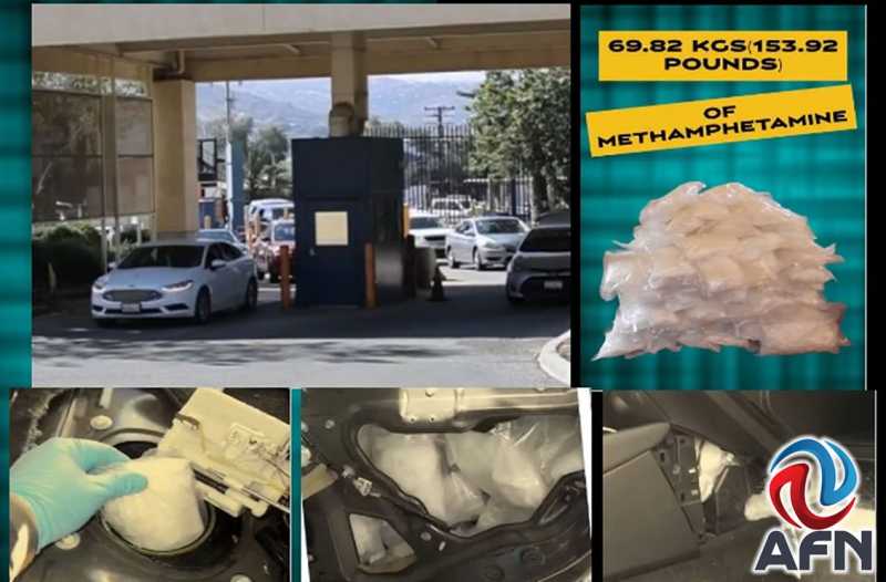 SAN DIEGO CAL EU 5 DE MARZO DE 2026 (AFN).- Agentes de Aduanas y Protección Fronteriza de Estados Unidos (CBP, por sus siglas en inglés) decomisaron un cargamento de 153.92 libras de metanfetamina, equivalente a 69.82 kilos, ocultos en un vehículo particular.