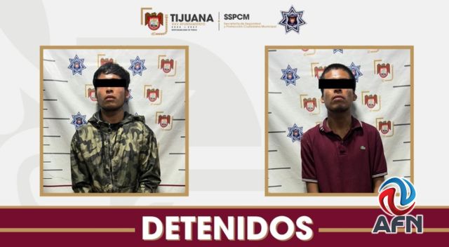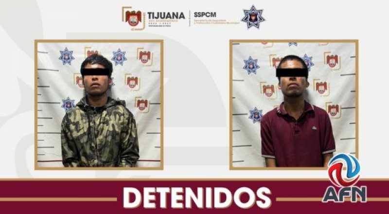 TIJUANA BC 18 DE MARZO DE 2026 (AFN).- Dos presuntos asaltantes de comercios fueron detenidos por elementos de la municipal, tras cometer un asalto, además de presuntamente estar relacionados con otros robos en la colonia Infonavit Alba Roja, según información de la Secretaría de Seguridad y Protección Ciudadana Municipal (SSPCM).