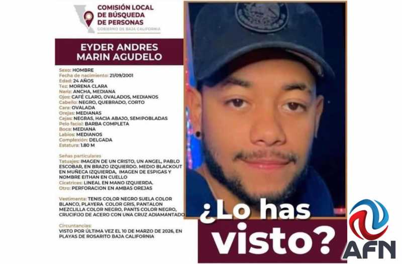 TIJUANA BC 26 DE MARZO DE 2026 (AFN).- Un ciudadano de origen colombiano fue reportado como desaparecido en Tijuana, por lo que familiares solicitaron apoyo a colectivos de búsqueda, quienes ya coordinan acciones con la Fiscalía General del Estado para dar con su paradero.