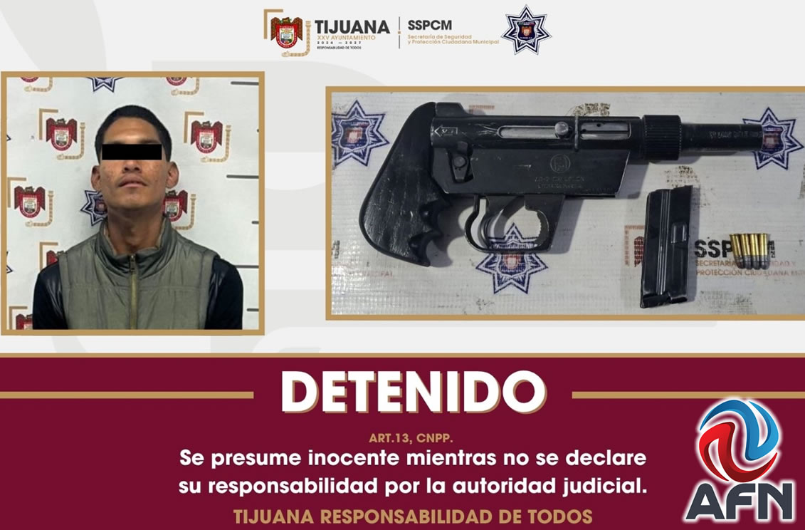 La Secretaría de Seguridad y Protección Ciudadana Municipal (Sspcm) de Tijuana informó que, como resultado de los recorridos preventivos de vigilancia en zonas prioritarias, los agentes detuvieron a Jesús Joel "N", de 26 años, por la portación de arma de fuego.