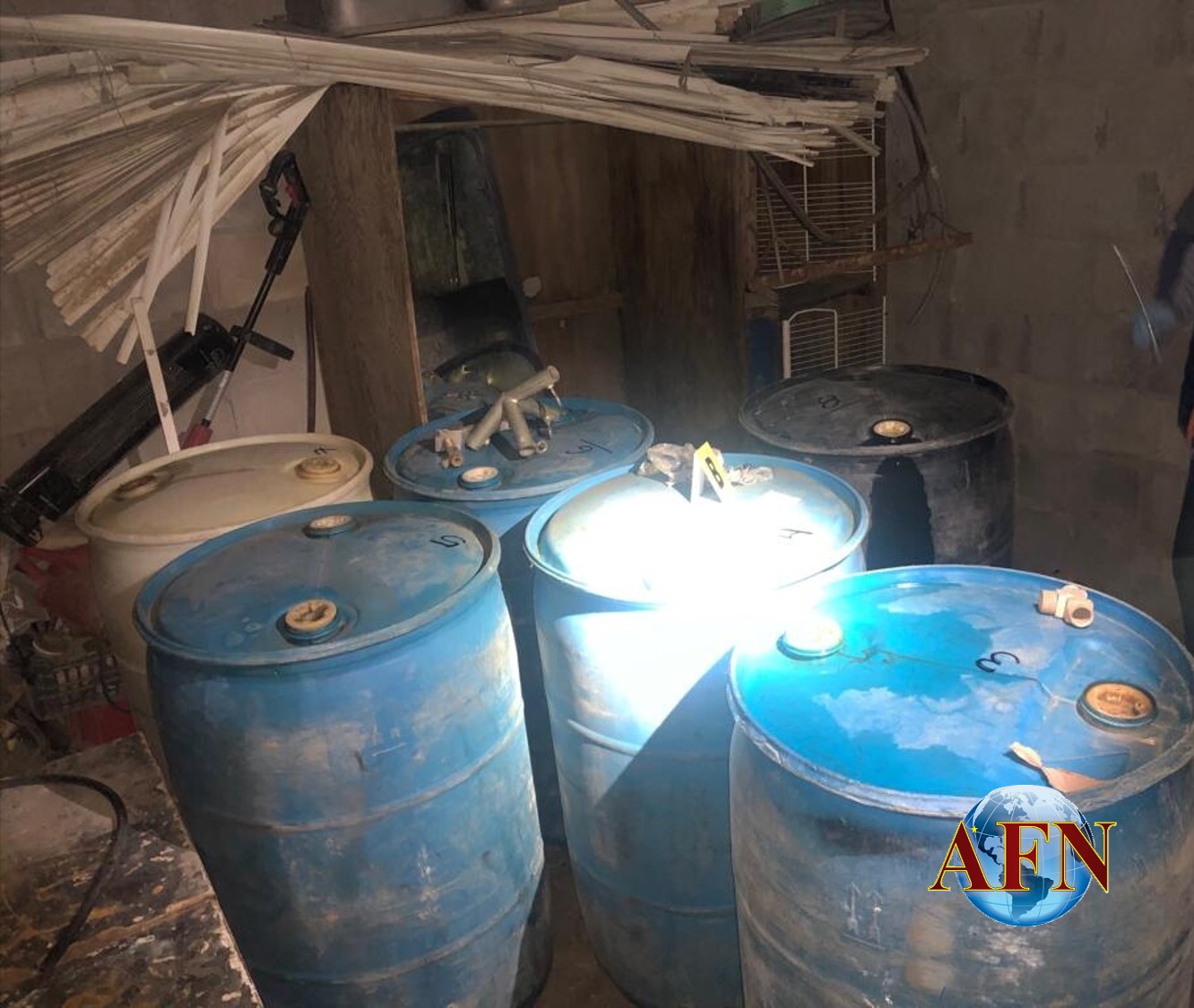 Luego de trabajos de investigación, fueron ubicados ocho bidones con capacidad de 200 litros cada uno y tres vehículos automotores, dentro de una vivienda.