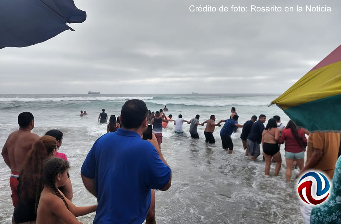 PLAYAS DE ROSARITO BC, 28 DE JUNIO DE 2019 (AFN).- Decenas de personas que este domingo se encontraban tomando el sol en las costas del quinto municipio formaron una cadena humana para rescatar a dos bañistas que se estaban ahogando.