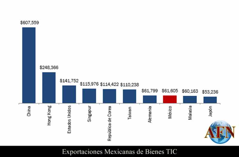 Esto ubicó al país como la octava economía con mayores ventas al exterior de este tipo de bienes, lo que redundó en una participación de 3.2% del total mundial de las exportaciones TIC. Este indicador resultó en 31.2% para China, 12.8% para Hong Kong, 7.3% para Estados Unidos, 6% para Singapur, 5.9% para Corea, 5.7% para Taiwán, y 3.2% para Alemania.