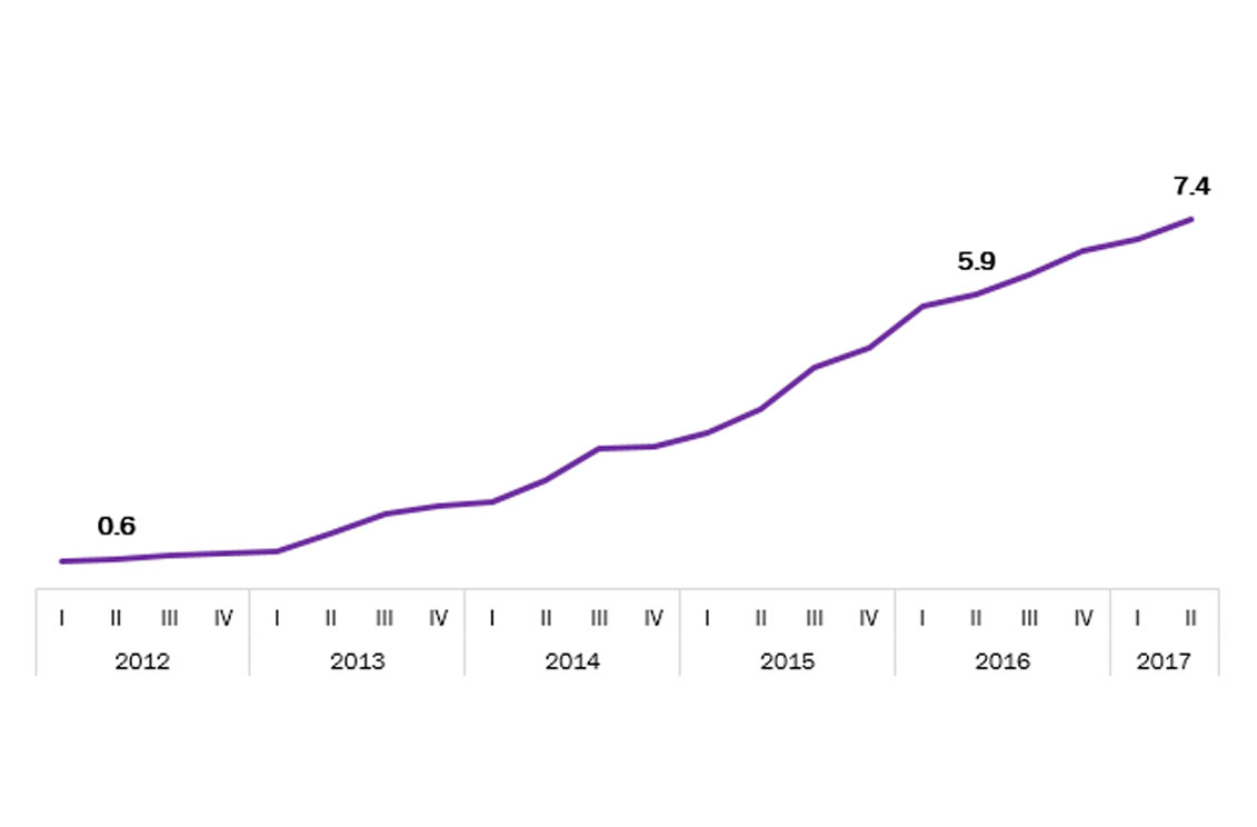 En México, las plataformas de SVOD alcanzan una contabilidad de 7.4 millones de suscripciones al finalizar el segundo trimestre de 2017, esto es 25.6% que un año antes y más de 12 veces la cifra de tan sólo un lustro atrás. Esta creciente base de usuarios resulta de la incesante penetración de internet entre la población, la asequibilidad del servicio frente a la TV de paga, así como de la preferencia por las producciones originales exclusivas y de acceso ubicuo desde una diversidad de dispositivos conectados.